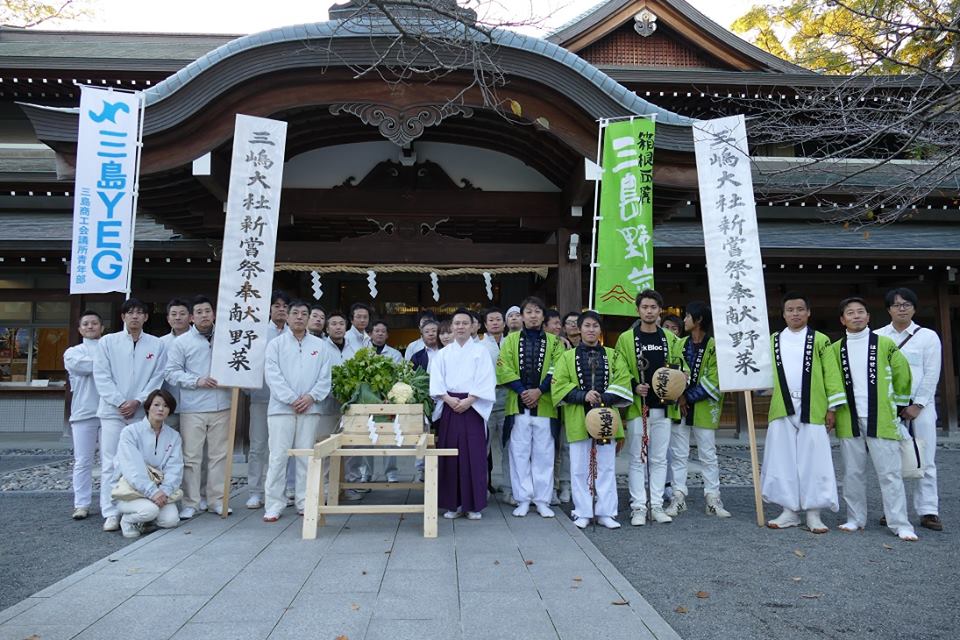 秋の収穫、五穀豊穣の感謝を神に伝える三島大社の三大神事の一つである新嘗祭(にいなめさい)を、三島の感謝の祭りとして市民に広めようと、当三島商工会議所青年部が立ち上がって始まった、この秋のお祭り。